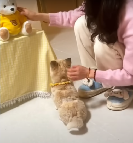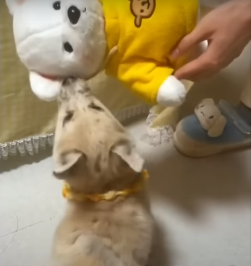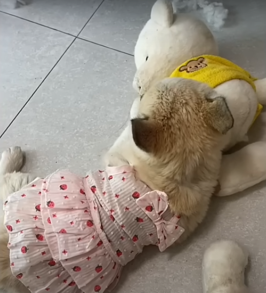 In celebration of his resilience, the rescuers gifted him a charming pink dress, a symbol of his new beginning. The puppy, now more sociable and open, seemed to embrace life fully. But then, a mishap occurred—the Teddy bear was accidentally damaged, plunging the puppy into despair.