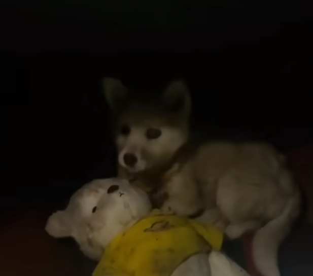 Led by the puppy to a hidden spot, they discovered the heart-rending truth: the puppy wasn’t alone. His constant companion during these tough times was a small white Teddy bear. This wasn’t just any toy; it was his confidant, his pillar of strength, showered with endless kisses and affection by the puppy.